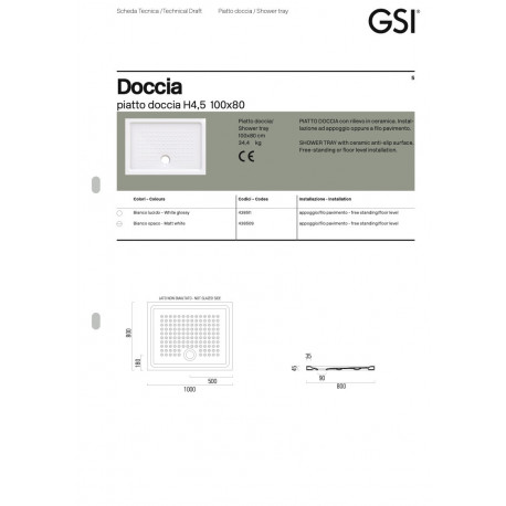 GSI > Санфаянс (Санітарна кераміка) > Підвісні унітази > Prostokątne > Піддон прямокутний GSI Extra Flat 100X80 cm, керамічний - Glossy White