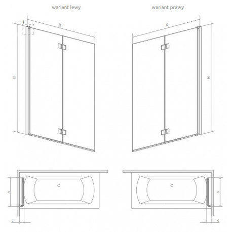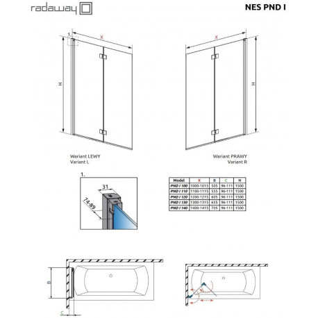Radaway > Душові кабіни > Штори для ванни > Nes > Ширма для ванни Radaway nes Brushed Gold PND I 100, правий, складаний, скло прозоре, 100x150cm, profil золотий szczotkowany